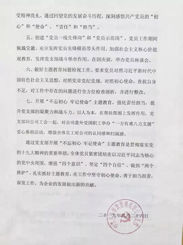 通过党支部开展“不忘初心 牢记使命”主题教育是贯彻落实党的十九大精神的重要举措,全体党员紧密团结在以习近平同志为核心的党中央周围,增强“四个意识”、坚定“四个自信”、做到“两个维护”,扎实抓好主题教育,在工作中坚守初心使命、勇于担当担责,奋发工作,为企业的发展做出新的贡献。