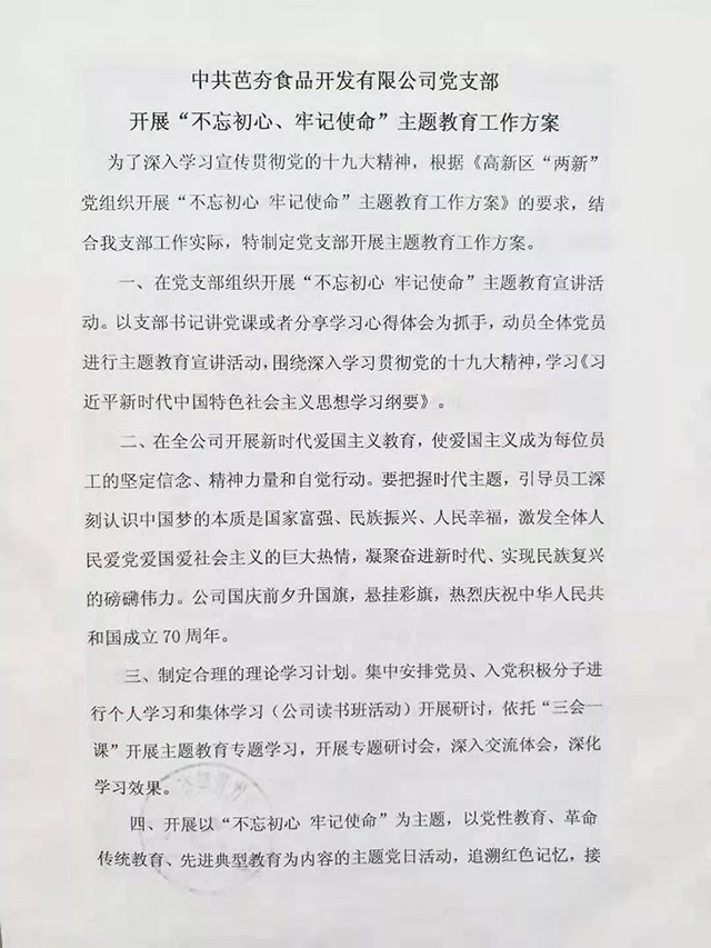 为了深入学习宣传贯彻党的十九大精神,根据《高新区“两新”党组织开展“不忘初心 牢记使命”主题教育工作方案》的要求,结合我支部工作实际,特制定中共芭夯食品开发有限公司党支部开展主题教育工作方案。