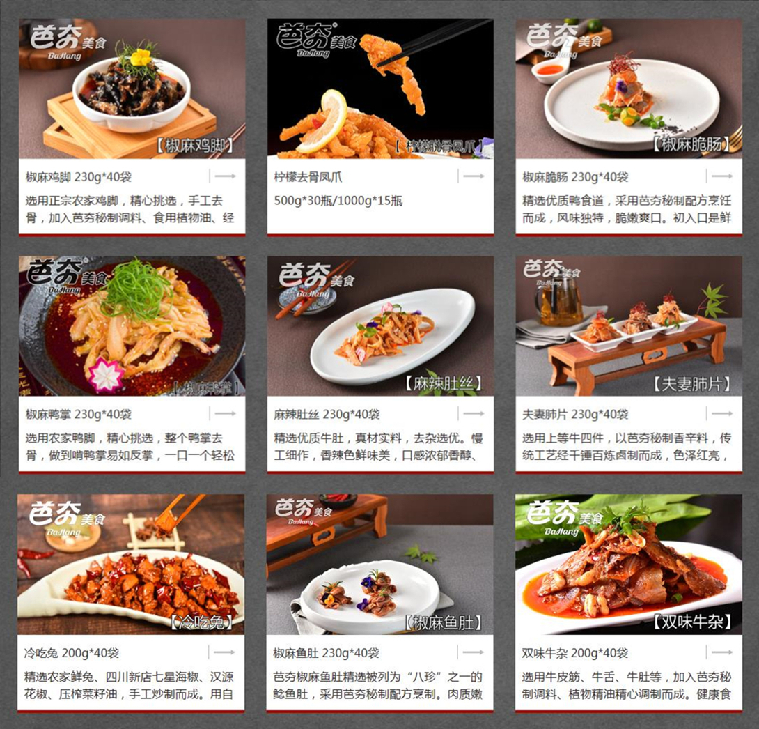 作为自贡知名品牌,芭夯食品致力于为人们提供丰富、营养、美味的成品、半成品菜品。公司现有佐餐、调理、酱腌、零食系列食品,既可开袋即食,又能稍微烹饪食用,配合各种自制调料,在家就能轻松做出媲美大厨的年夜饭。