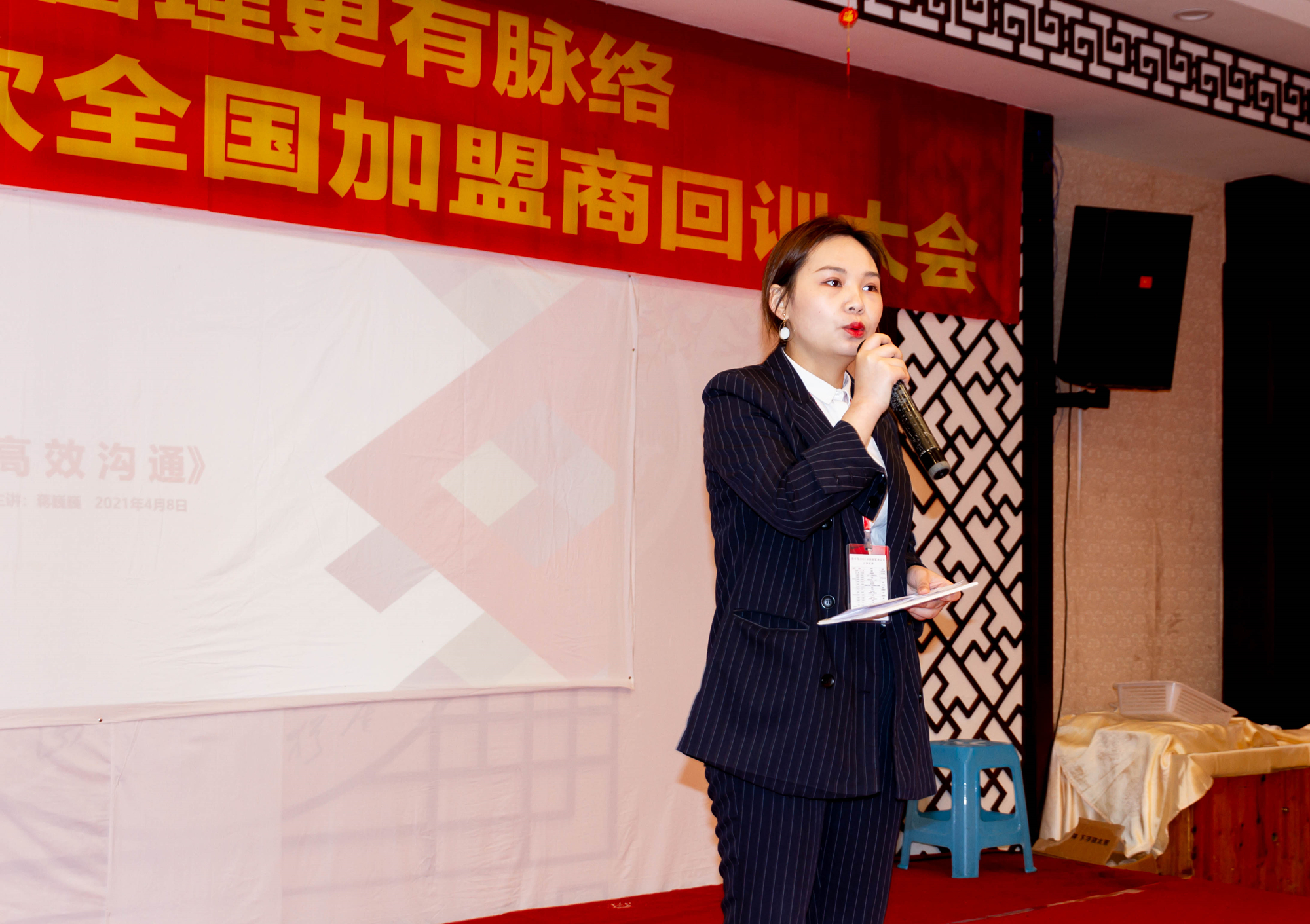 会议第二天,举行以“高效沟通”为核心主题培训会,会议邀请了上海财经大学EDP、复旦总裁班“领导力”领域实战讲师蒋巍巍老师,为加盟商讲解高效沟通的技巧等内容,加盟商积极参与互动,发表自己的想法,从实战中获取经验。