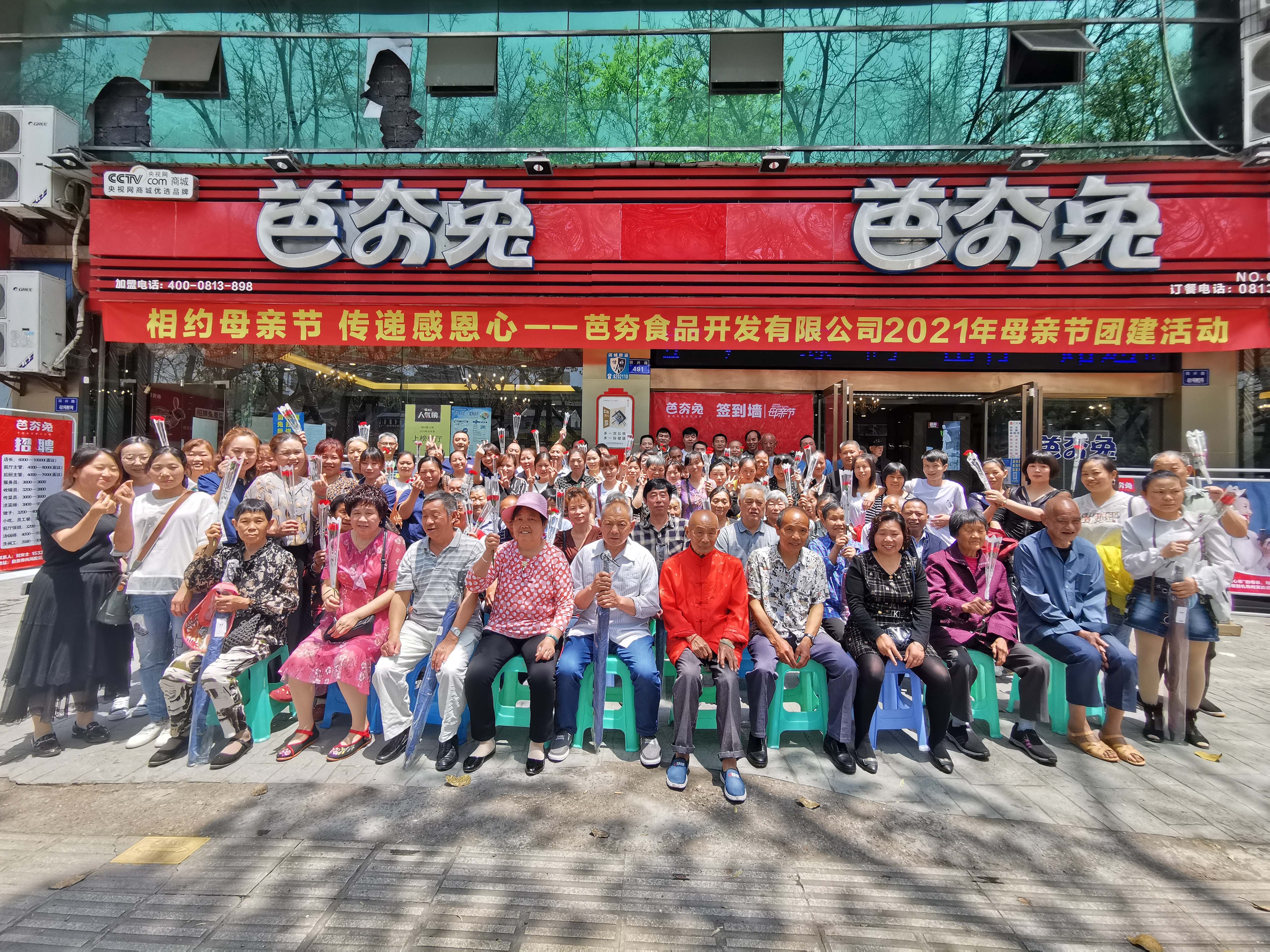 热闹的就餐后,全体人员在门店前合影留念。虽然活动结束了,但大家对母亲的感恩之心永在。借此机会,芭夯集团也向天下所有母亲表示诚挚的问候和真挚的感谢,祝母亲们节日快乐!