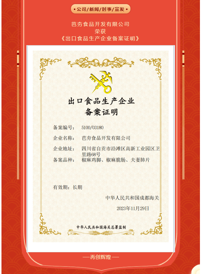 芭夯大事件--荣获《出口食品生产企业备案证明》